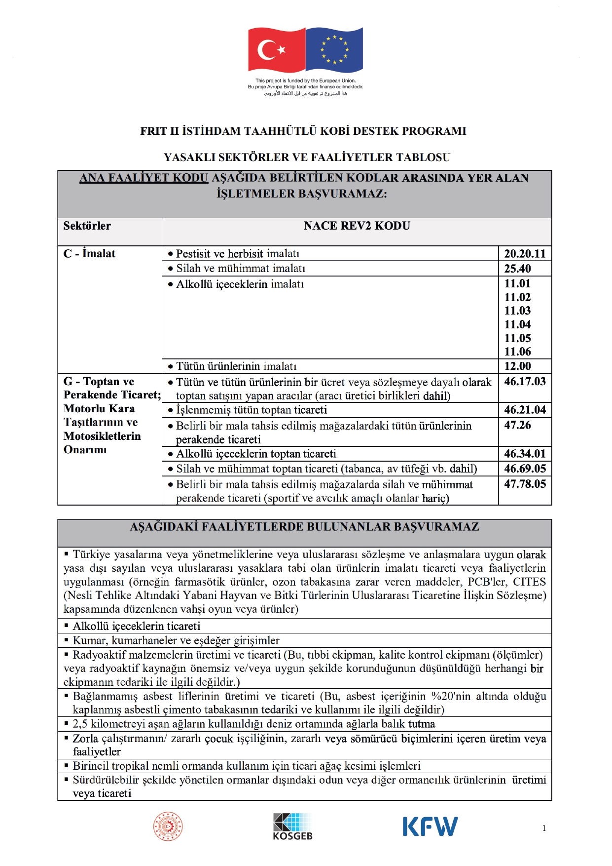 ✔ İşletmenin mali kayıtlardaki ana faaliyet kodu, KfW’nin “Uygun Bulunmayan Sektörler ve Faaliyetler Tablosunda” yer almamalıdır.